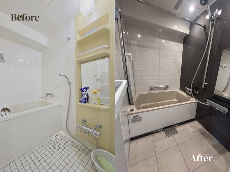 さらに床のタイルも大きめのデザインへリニューアルし、広く見えるスタイリッシュなバスルームに仕上がりました。